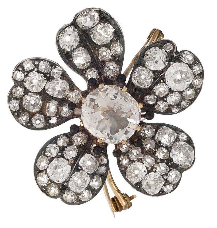 An antique diamond and silver-topped gold brooch retailed by S.J. Phillips, London