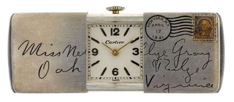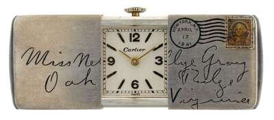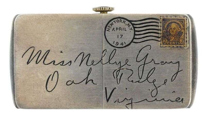 designed as an envelope that splits open to reveal watch, square white dial with Arabic and baton numerals, signed by the maker, numbered 5542, mechanical movement, stamp dated April 17, 1941; inscribed on front "Miss Nellye Grey, Oak Ridge Virginia".