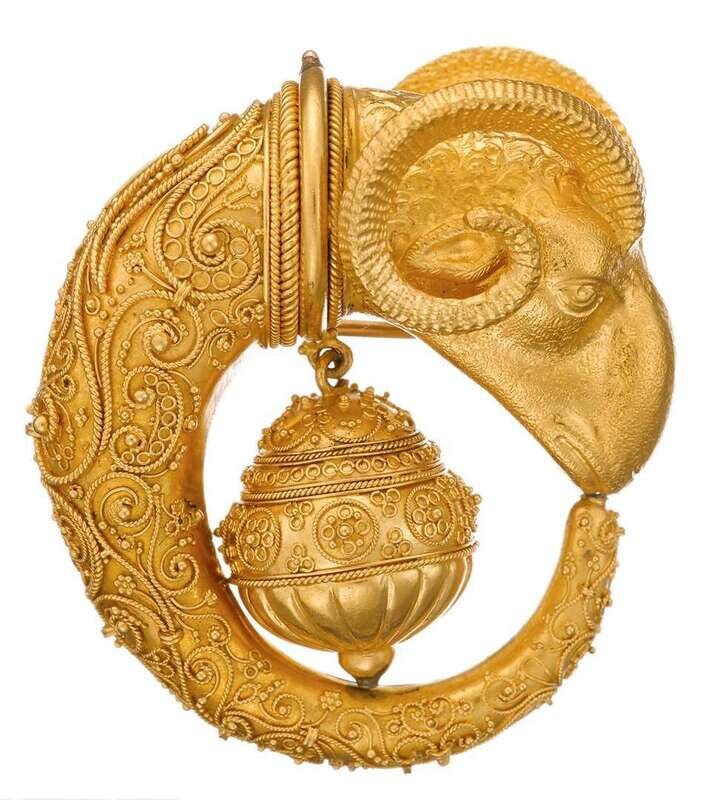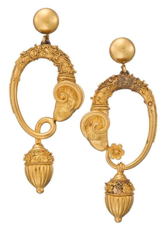 designed as a ram's head with granulated gold wire and bead detail; screwbacks.