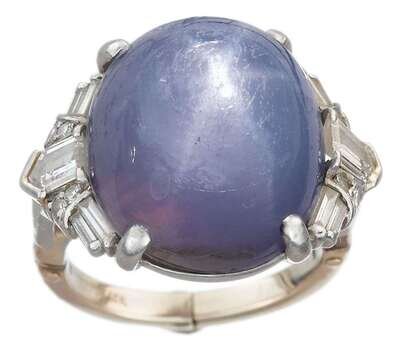 centering a cabochon sapphire and accented by full, baguette and bullet-cut diamonds; sapphire weighing approximately: 38.75 carats; total diamond weight approximately: 0.85 carat.