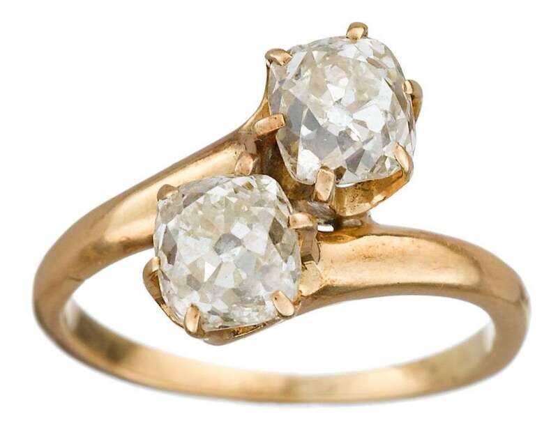 set with two old mine-cut diamonds; diamonds weigh approximately: 0.75 carat respectively.
