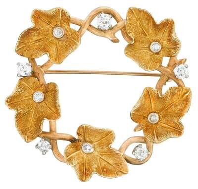 designed as a wreath of leaves accented by circular-cut diamonds; total diamond weight approximately: 0.60 carat.