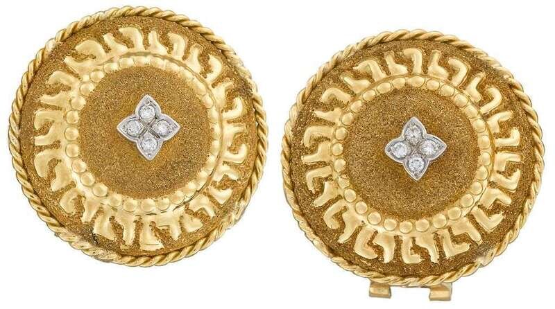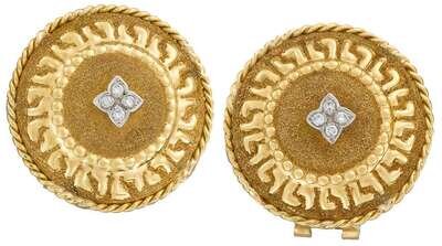 textured and polished gold geometric motif, accented by round-cut diamonds; stamped with Portuguese marks.