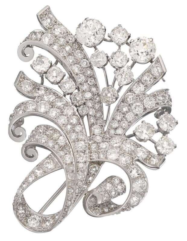 surmounted by two old European-cut diamonds weighing approximately: 1.55 and 1.20 carats respectively, accented throughout with numerous old European-cut diamonds; remaining total diamond weight approximately: 9.40 carats.