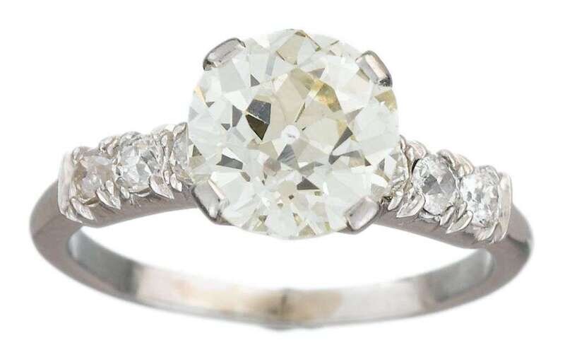 set with an old European-cut diamond, flanked by circular-cut diamonds; center diamond weighing approximately: 2.00 carats.