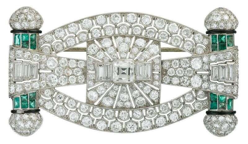 An Art Deco diamond, emerald, enamel and platinum brooch circa 1930