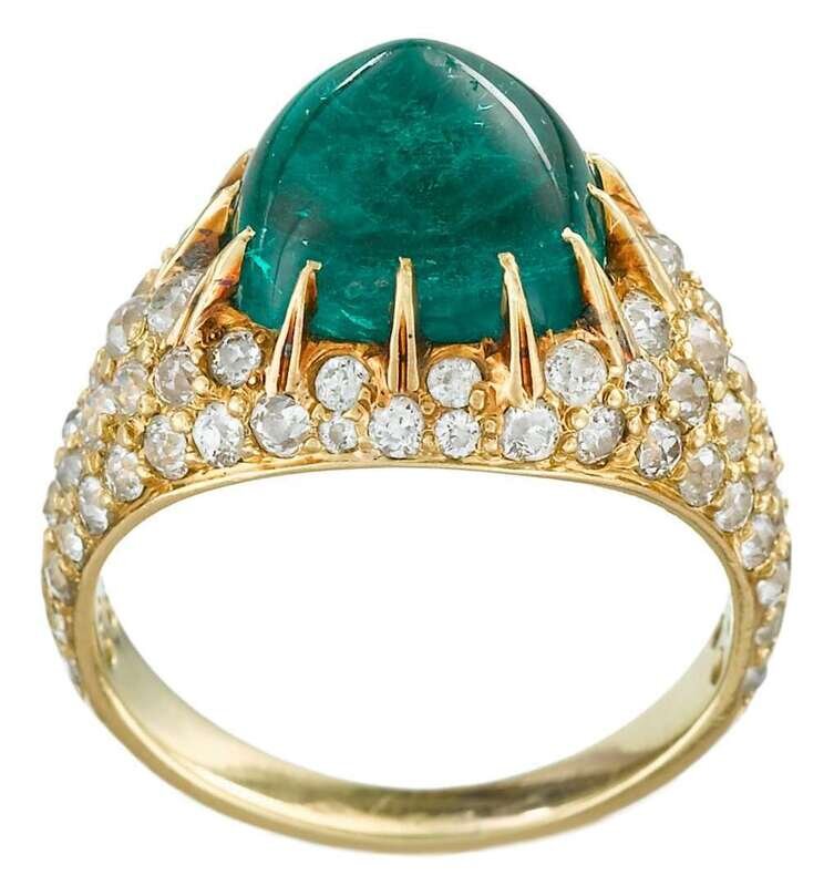 centering a sugarloaf emerald, measuring approximately 9.80 x 8.40 x 8.50mm, within a pavé diamond setting; total diamond weight approximately: 1.45 carats; signed B B & B and numbered 25128.