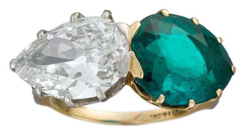 set with pear-cut diamond, approximately: 3.85 carats and a pear-cut emerald approximately: 3.40 carats, and accented by circular-cut diamonds; signed Tiffany & Co.