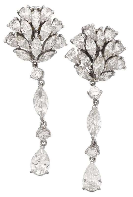 suspending two pear-cut diamonds weighing approximately: 0.70 and 0.60 carat respectively, accented by marquise, pear and round brilliant-cut diamonds; remaining diamond weight approximately: 5.30 carats.