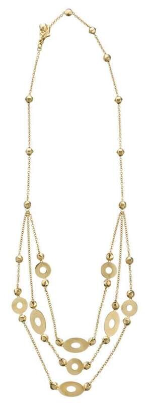 designed as a triple swag with polished gold beads and flat links; signed Bulgari.