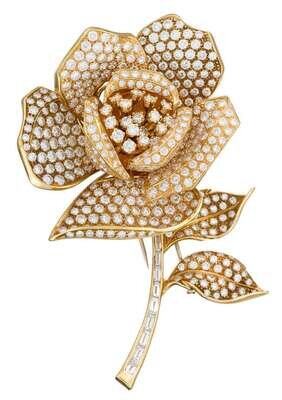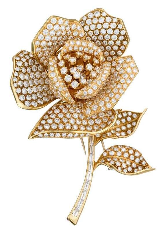 in the form of a rose, the high relief clip contains numerous round brilliant-cut diamonds with a baguette-cut diamond-set stem; total diamond weight approximately: 29.40 carats.