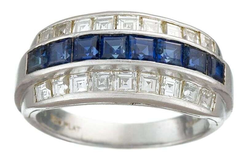 channel-set with square step-cut diamonds and sapphires; total diamond weight approximately: 0.85 carat; signed Cartier and numbered 34909.