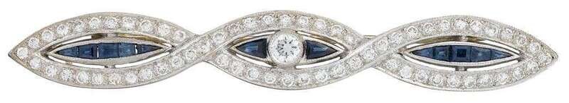 A diamond, sapphire and platinum-topped eighteen karat gold bar pin