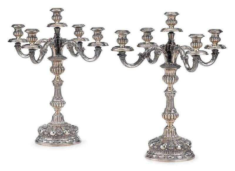 The fluted and lobed knopped standard issuing four scroll arms terminating in bobeches with drip pans, the circular lobed base with alternating floral panels, .800 standard. (2).
