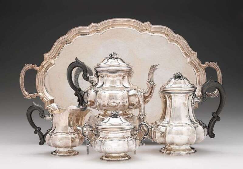 Comprising a coffee and teapot, creamer, sugar, and silverplated tray, octagonal lobed form squat bodies with wooden C- and S- scroll handles and floral bouquet finials, raised on similar octagonal foot, .800 standard. (5).