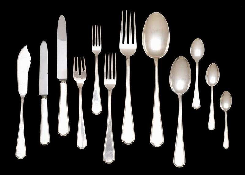 Comprising twelve each dinner knives and forks, luncheon knives and forks, fish knives and forks, tablespoons, demitasse spoons; twenty-four teaspoons, twelve unmarked in similar pattern; and a serving fork and spoon, .800 standard. (122).