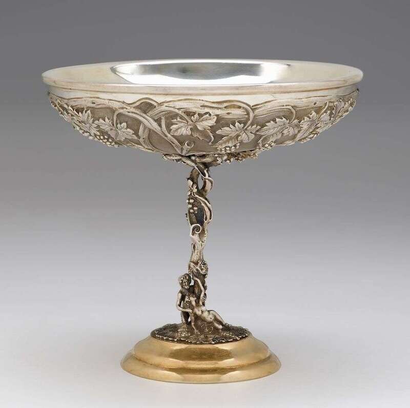 Shallow circular bowl, the sides with a matted stippled surface and a fruiting vine band issuing from the open-work cast stem, the base with a kneeling figure of Satyr caressing a nude female figure, on a raised circular silver-gilt base, underside marked "Sterling", "925", and "Made in Italy".