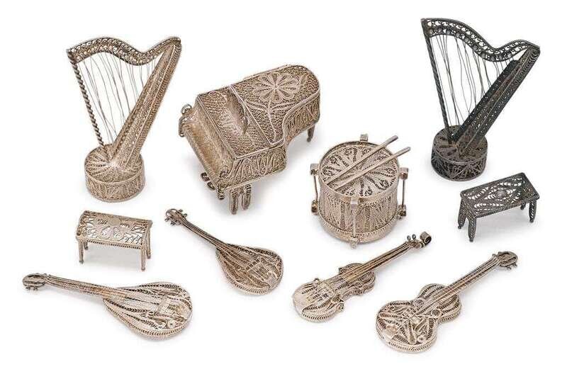 Comprising a piano, a drum, a violin, a guitar, two mandolins, two harps and two benches. (10).