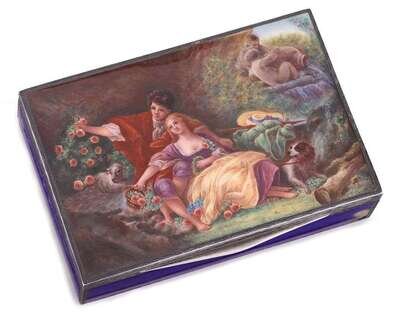 Rectangular form with cobalt blue enamel over an engine-turned ground, the lid painted with a romantic couple and animals in a garden, gilt-washed interior.