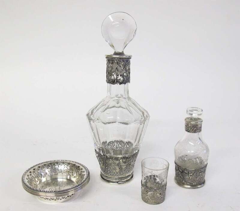 Comprising two decanters, the smaller with etched glass and marked for Germany, and a small cup, glass etched with scrolling foliage; together with four reticulated silver nut dishes by Gorham Mfg. Co. (7).