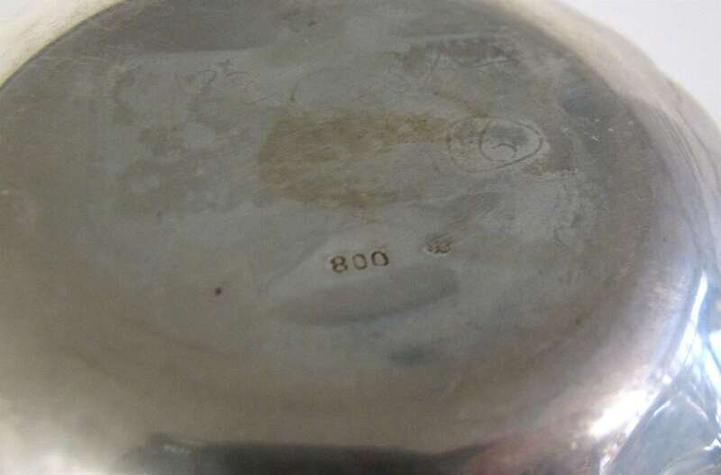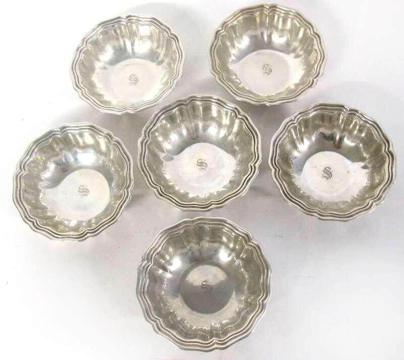 Shaped circular form with lobed body and reeded rim, monogrammed, .800 standard. (6).