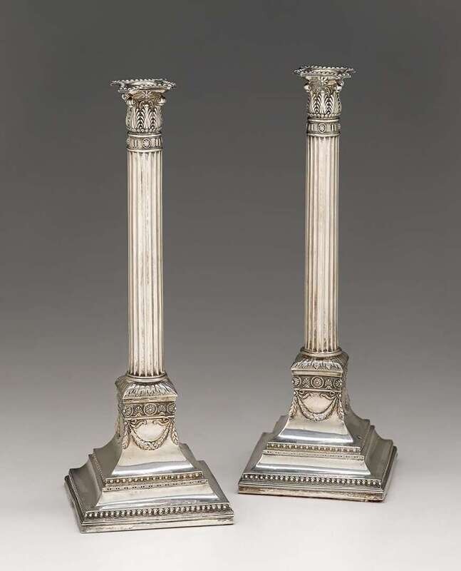 Corinthian column-form candlesticks with foliate and scroll capital over cylindrical reeded standard, with swags and shell details below, raised on stepped square base with dot border, .800 standard. (2).