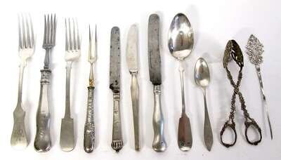 Including knives, forks, carving sets, spoons, skewers, and tongs from countries such as Austria, Latvia, France, and Italy, some monogrammed. (approx. 71 pieces).
