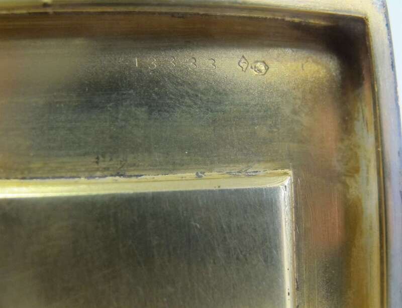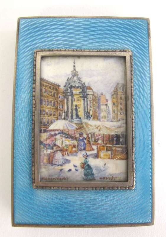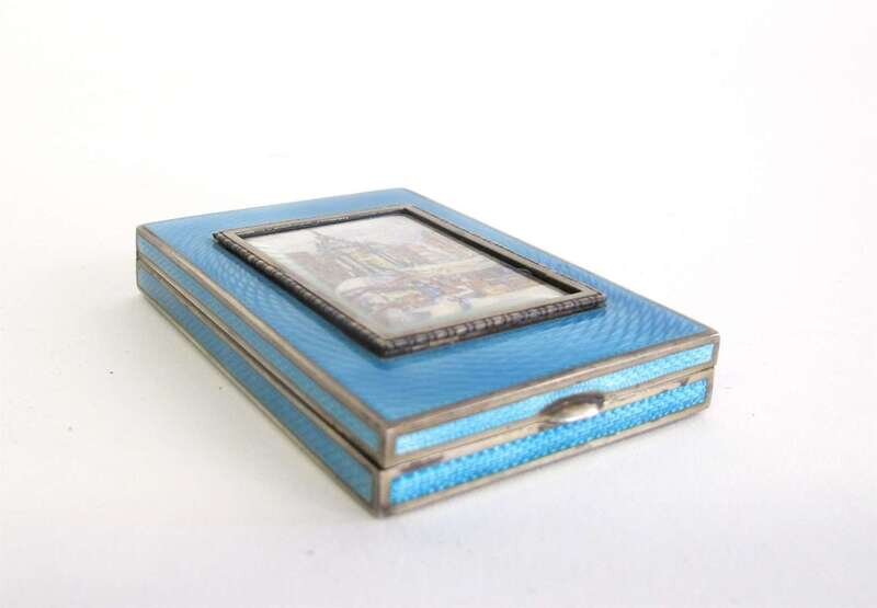 Rectangular form with sky blue enamel over an engine-turned ground, the hinged lid inset with a painting of figures in a cityscape, the painting signed "Moher Marks?" lower left and "M. Reschay"? lower right, with gilt-washed interior, .900 standard.