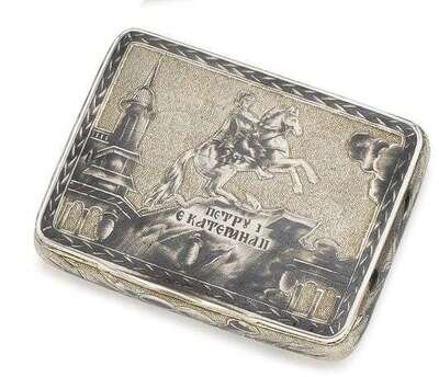 Rectangular form with rounded corners, the cover worked to show the Bronze Horseman after Falconet, the underside a trophy, both on a stippled ground.