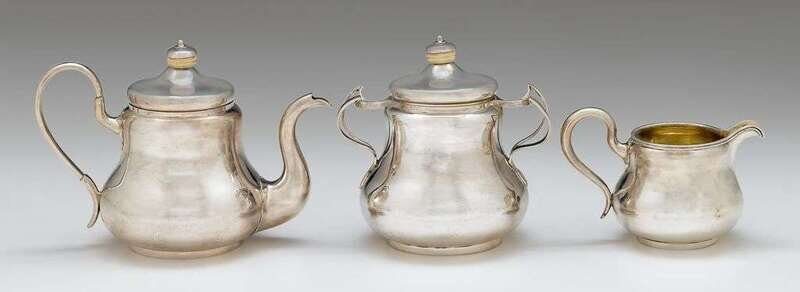 Comprising a teapot, covered sugar, and creamer, baluster form with scrolling handle and spout, gilt-washed interiors, 84 zolotnik, marked for Ivan Gubkin, Moscow, 1856.