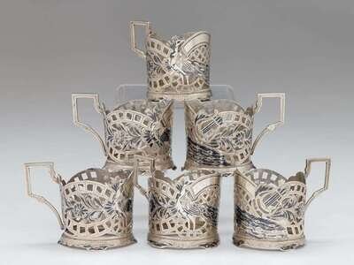 Recticulated cylindrical form decorated with floral blossom and peacock with long feathered tail wrapped around body, with angular handle, 84 zolotnik. (6).