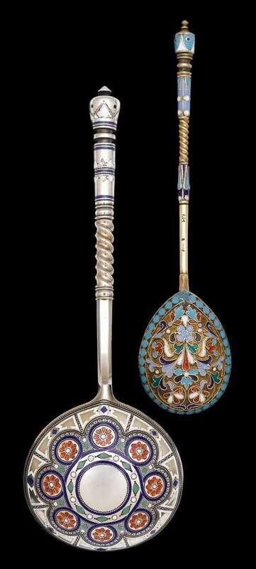 Two Russian silver and enamelled spoons ivan khlebnikov, moscow, 1875