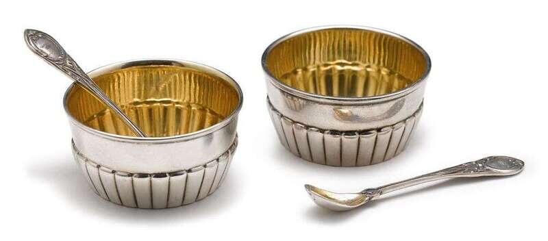 Pair of Russian silver salts and spoons fabergé, moscow, 1895, assaymasters anatoly artsybashev and alexander smirnov