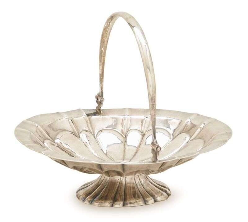 Oval lobed form body, raised on conforming foot, with swing handle, 84 zolotnik, maker's mark unidentified.