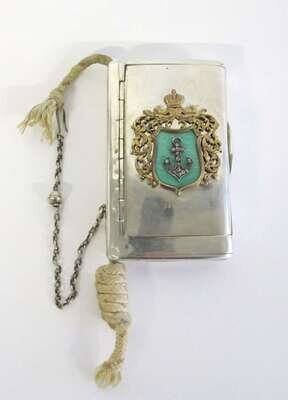 Rectangular form with hinged lid, later applied with silver and diamond anchor within a shield-form enamelled green and silver-gilt cartouche, with match safe and gilt-interior, 84 zolotnik.