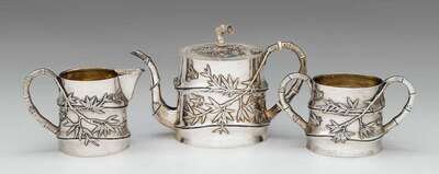 Comprising a teapot, creamer, and open sugar, oval form with bamboo leaves to body, bamboo branch-form handle and finial, with gilt-washed interior. (3).