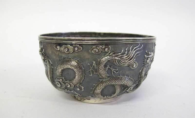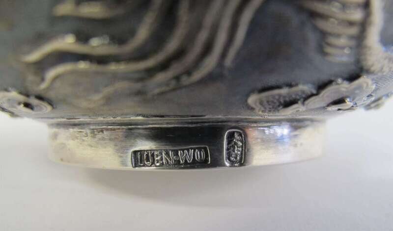 Small bowl with repoussé dragons on a textured ground, stamped "Luen-Wo" and a character mark to foot rim.