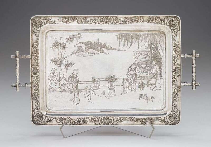Rectangular form with twin bamboo-form handles, the tray engraved with four figures in a courtyard, repoussé rim with C-scrolls and foliage on a stippled ground, raised on four feet.