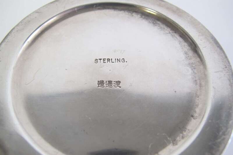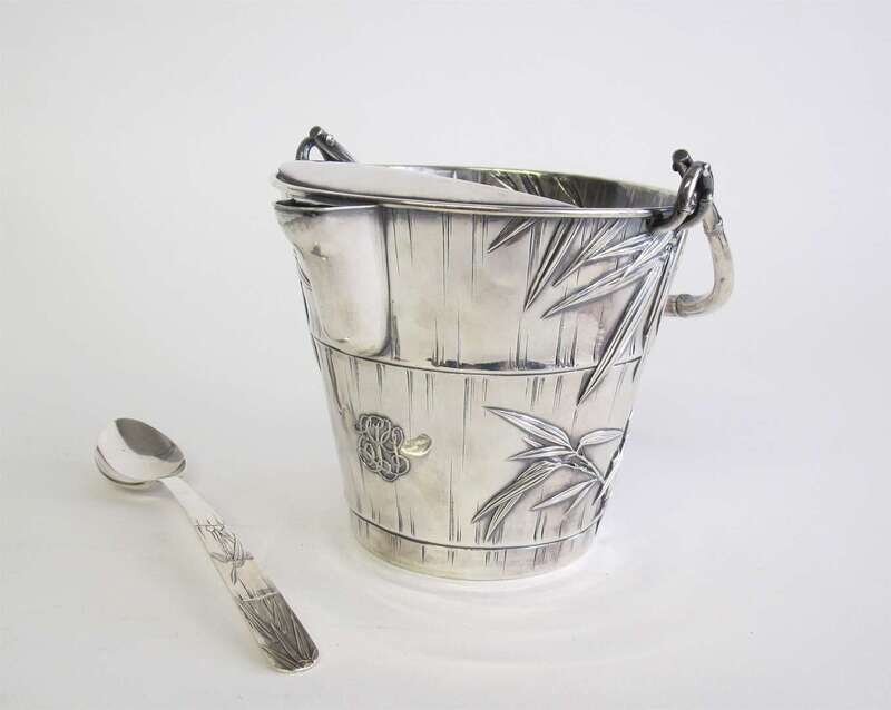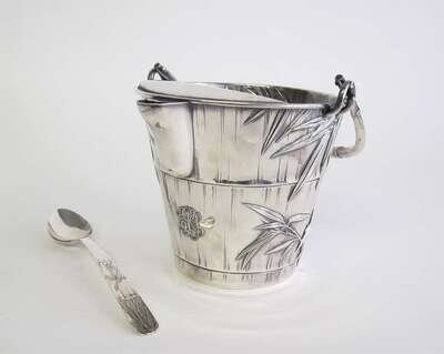 Bucket with repoussé-worked bamboo leaves, swing bamboo stem handle, underside of bucket marked "Sterling" with three Chinese characters, monogrammed; spoon with similarly decorated handle, apparently unmarked. (2).