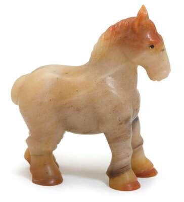 Naturalistically carved to depict a standing horse inset with semi-precious stone eyes, surrounded by gold loops.