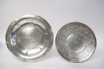 Circular form, wide rim decorated with bellflower swags and bows, monogrammed to center; together with a serving dish by Towle Silversmiths, Newburyport, MA, circular lobed form body with reeded edge and repoussé flowerheads to rim, scratch mark "2561503" to underside. (2).