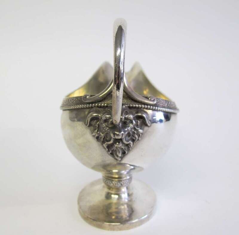 Typical form with beaded edge and scroll motif band to rim and neck, scroll-form handle with mythological mask below, monogrammed.