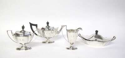 Comprising a teapot with wooden handle, twin-handled covered sugar, and creamer, angular handles and wooden urn-form finials; together with a covered vegetable dish in similar design and square-form card tray with repoussé floral rim, monogrammed. (5).