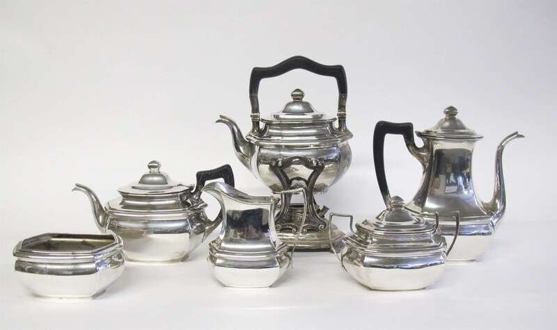 Comprising a hot water kettle on stand, a coffee and teapot, covered sugar, creamer, and wastebowl, hexagonal baluster form, with ebonized wood angular handles. (6).