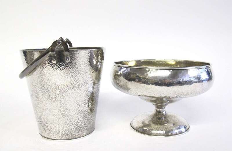 Together with a hammered silver bucket with swing handle marked "Sterling" to underside. (2).