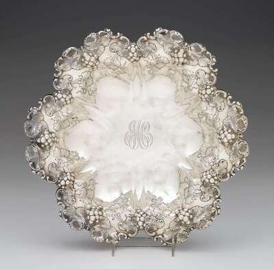 Lobed bowl, shaped rim with berry clusters, stippled leaves, and C-scrolls, monogrammed to center.