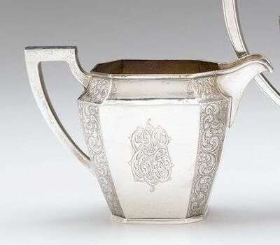 Oblong octagonal form with alternating panels of engraved floral and scroll motif.