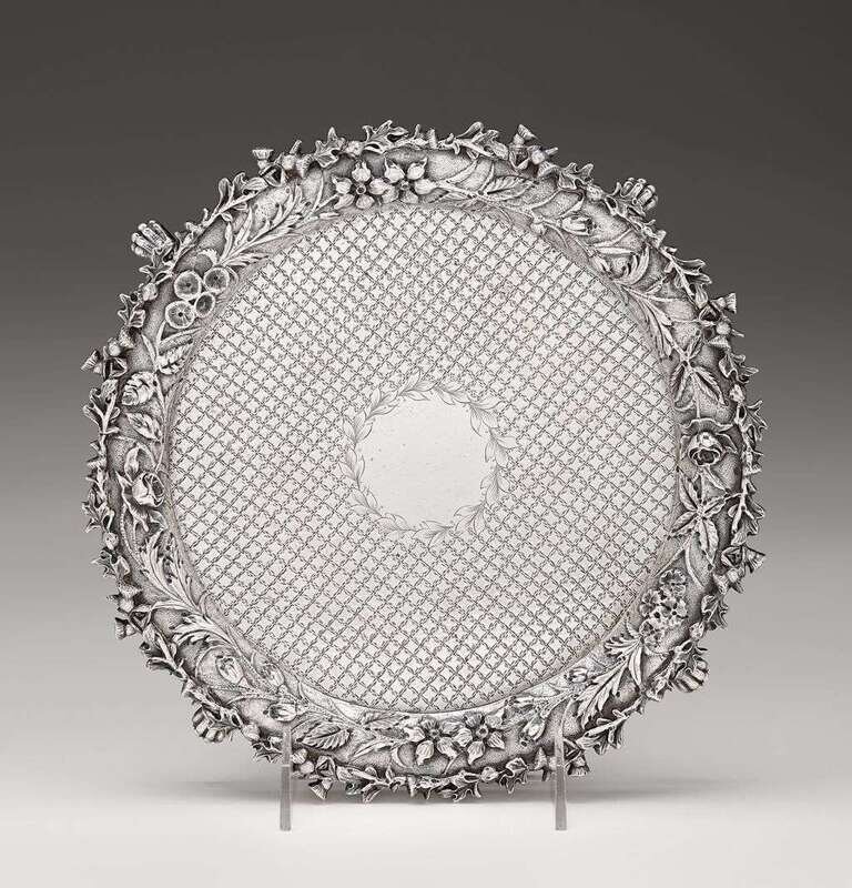 Circular form with diaper-work ground to center, within a floral repoussé rim, raised on four paw feet, blank reserve to center within foliate wreath.