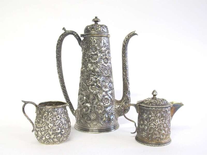 Tapering cylindrical form repoussé-worked all over to depict various flowerheads and foliage on a textured ground; together with two repoussé creamers by S. Kirk & Sons, 1861-68. (3).