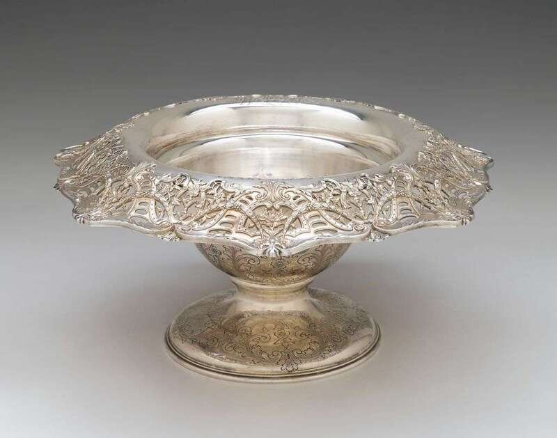 The openwork rim with floral swags, bellflowers, and scrolling foliage, the bowl and conforming circular foot with engraved and chased floral motif, monogrammed.